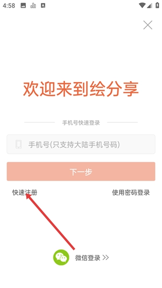在【绘分享】登录页面,点击【快速注册】选项,输入中国大陆手机号码后按下【下一步】按钮,即可继续注册流程,此外也能选择通过微信进行登录。