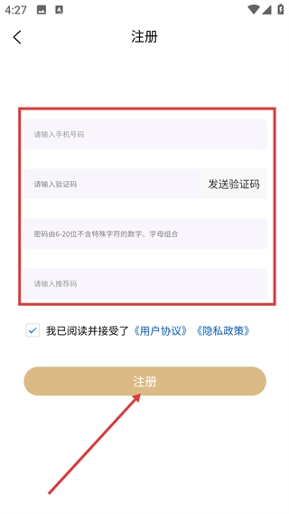 在注册界面,按顺序填写【手机号码输入框】【验证码输入框】【密码设置框】等内容,同意相关协议后点击【注册】按钮即可完成账号注册流程。