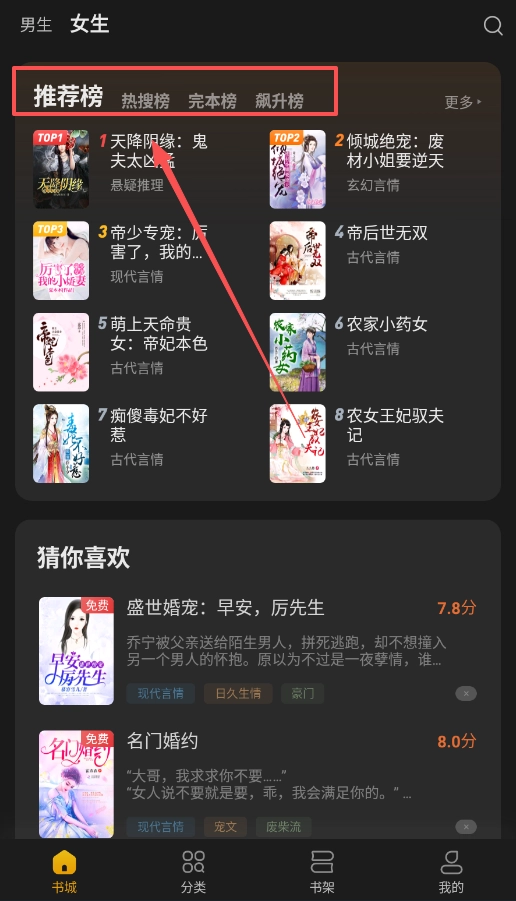 “书城”里的飙升榜、完本榜等多个榜单,是我们追踪热门趋势的窗口;此外,还有“猜你喜欢”这样的智能推荐功能。