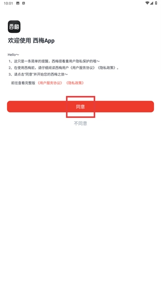 打开西梅App,仔细阅读《用户服务协议》和《隐私政策》的内容,确认无误后点击【同意】按钮,即可进入应用的主流程。