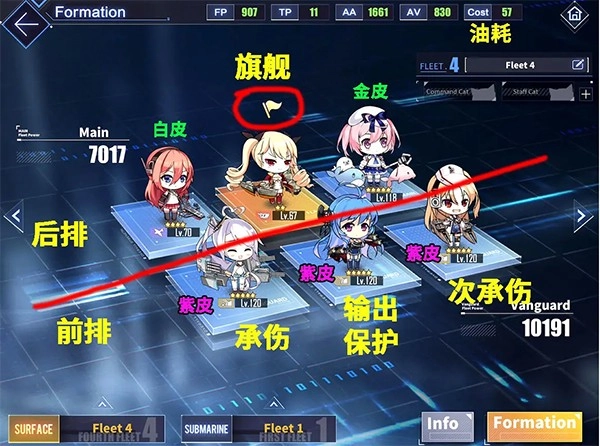 前排舰船具备一定输出能力,核心职责是提供火力掩护,具体包括承受敌方伤害、清理自爆船、执行防空任务等;同时承伤位还承担领队职能,后排两艘舰船需跟随其行动。承伤位通常选用重巡洋舰,但重巡速度相对较慢,可能会额外承受弹幕伤害。