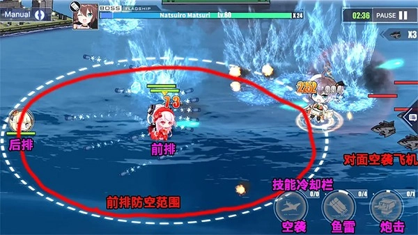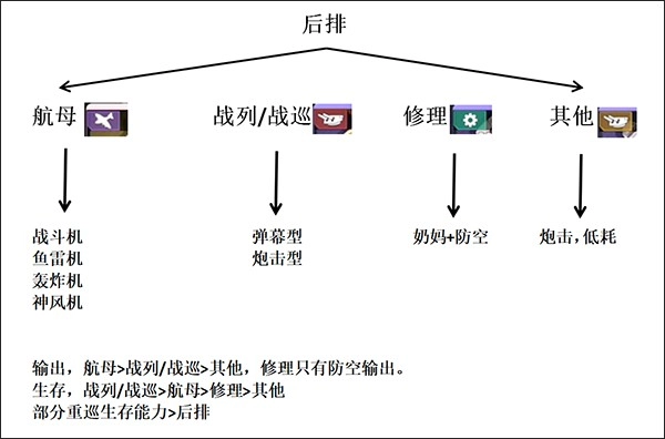 后排承担主力输出任务,同时也能清理前排漏过的自爆船;此外可选择专职修理舰或具备治疗能力的舰船来维持队伍血量。后排受到伤害的来源主要是自爆船和空袭,所以在防空压力大的关卡中,需要优先提升防空能力而非一味堆砌输出。