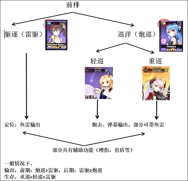 前排舰船的炮击频率和其主副炮的射速属性相关,防空圈的覆盖范围则取决于高射炮的有效射程;驱逐舰释放鱼雷需要等待技能冷却时间结束,在前期装备配置不佳时,驱逐舰的伤害表现会逊色于炮巡,同时驱逐舰自身生存能力较弱,因此前期更建议优先以炮巡作为主要的养成对象。