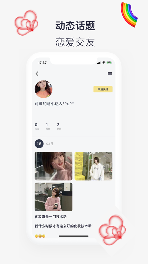 彩虹聊app上可以轻松找到有兴趣相同的好友,真人用户在线交友,一起分享生活,寻找自己的有缘人!