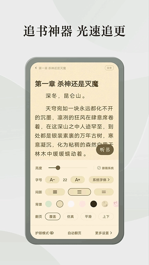 提供5档字体大小、8种背景色、3种翻页模式(仿真/滑动/覆盖),支持字号缩放至200%,适配近视、老花等特殊阅读需求。