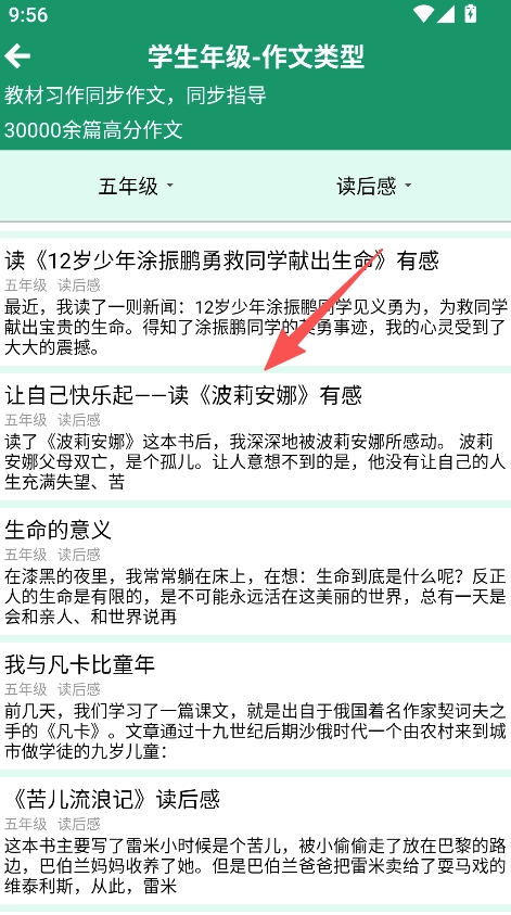 选定类型后,查看页面呈现的对应作文内容,以此获取作文参考资料。