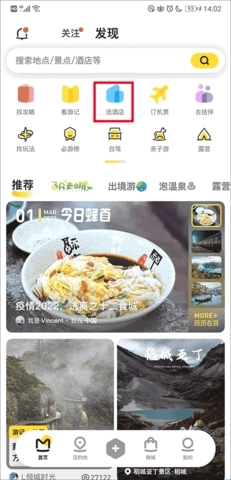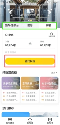 在酒店选择界面,确定好住宿类型后,找到并点击“搜索酒店”或者“查找民宿”的选项。该软件支持蜂友们选择的住宿类型包含国内港澳台、国际以及民宿这几种。