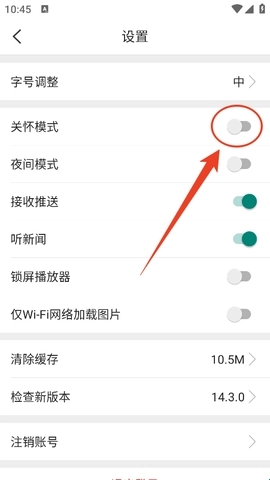 紧接着在设置页将“关怀模式”后面的开关打开。