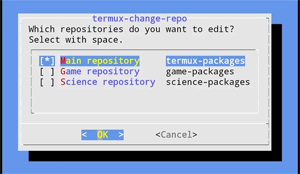 这里以清华大学开源软件镜像为例,在Termux中执行termux-change-repo命令,即可进入如下所示的图形界面。