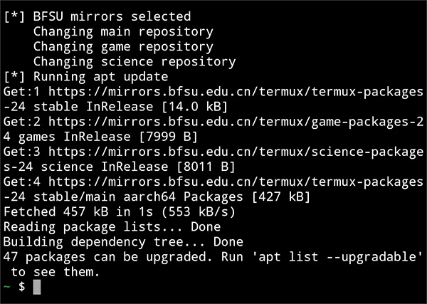 之后的配置操作和上面类似,只需将url替换为https://mirrors.tuna.tsinghua.edu.cn/termux即可。