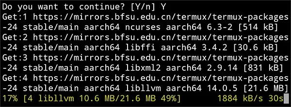在 Termux 里输入 pkg install python 并按下回车键来安装 Python,会出现像下面这样的图。