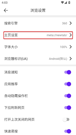 2、进入浏览设置的主页设置中