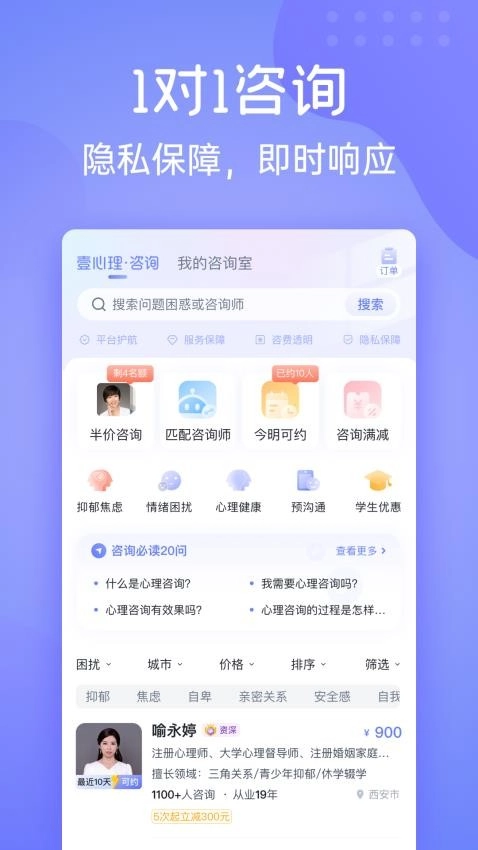 软件配备了筛选功能,用户能够依据城市、价格、问题类型等条件对咨询师进行筛选。