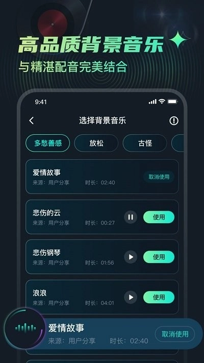 3、创意音效组合,拥有丰富的音效库与背景音乐资源,用户能够自由进行搭配使用,从而为配音作品增添个性化的表现力。