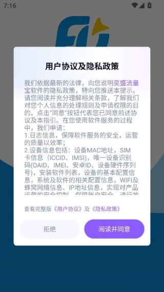 1、安装完成后打开软件,点击“阅读并同意”,即可启用流量管理与健康监测服务。