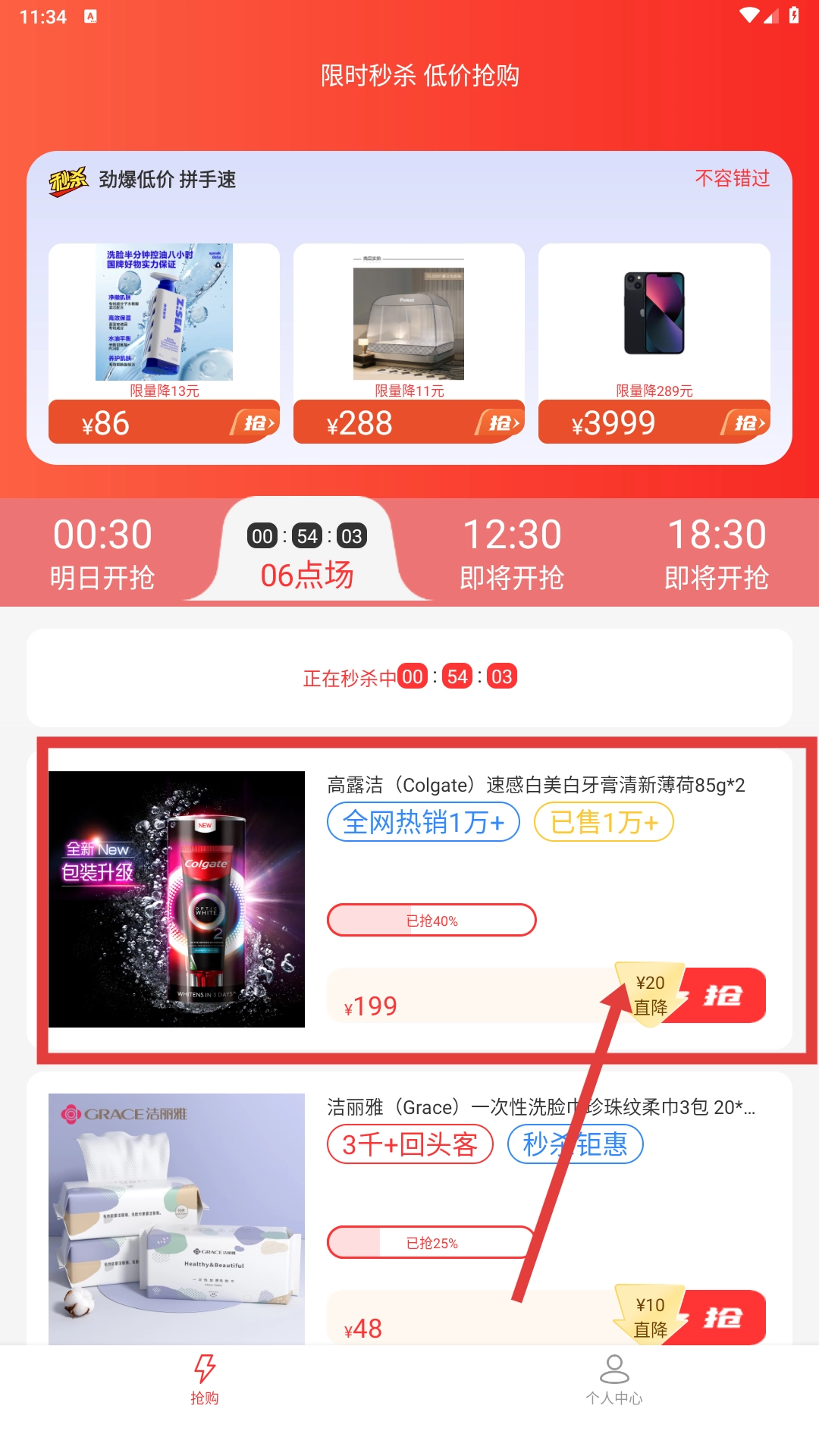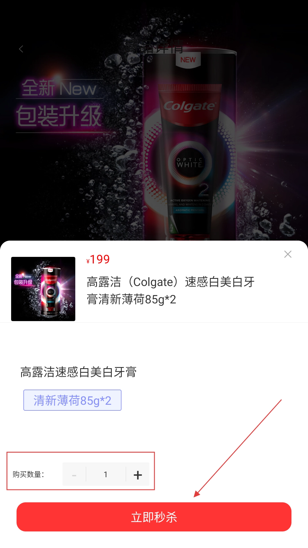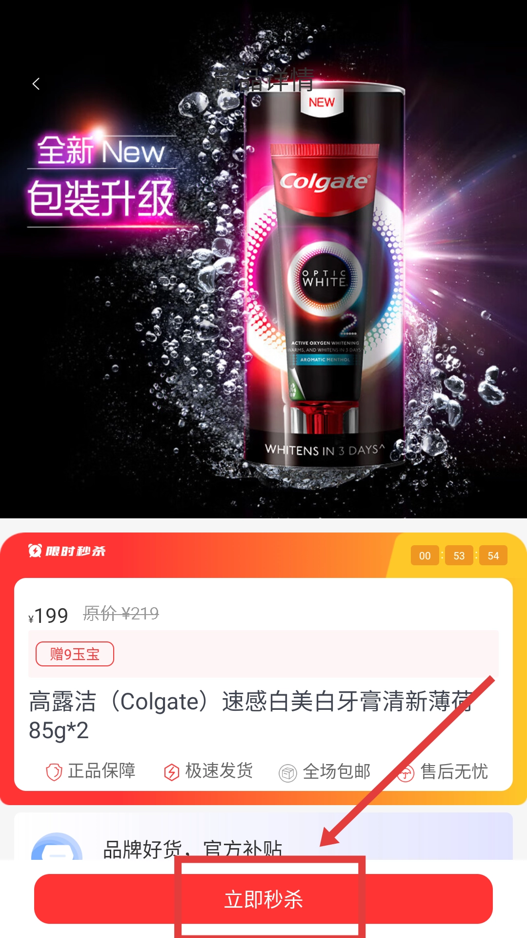 1、进入限时秒杀页面后,挑选想要的商品(例如高露洁速感白牙膏),点击该商品所在区域即可进入商品详情页。