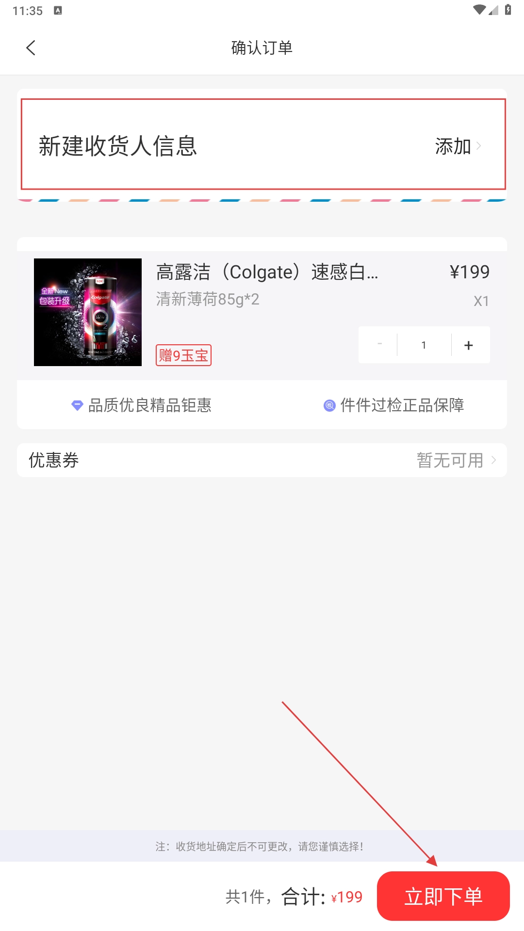 4、在确认订单页面,点击【添加-功能按钮】来完善收货人信息,确认好商品信息后,再点击【立即下单】按钮即可完成购买流程。