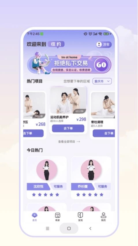 往约平台能有效帮助用户随时找到专业的按摩养护人员,用户可直接在线下单预约,从而及时获得服务;平台提供真实的服务项目和透明的服务费用,用户在应用内就能全面了解这些信息,以便放心下单,同时还能轻松管理自己的所有交易订单,保障自身的合法消费权益。