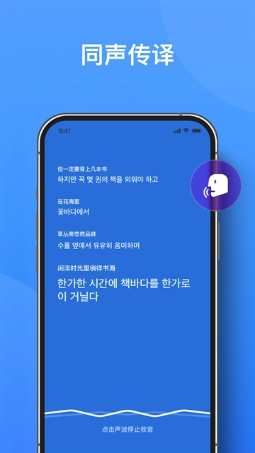 3、同声传译功能能够实时把语音识别成文字并进行翻译,在说话的过程中就能完成跨语言的转换。