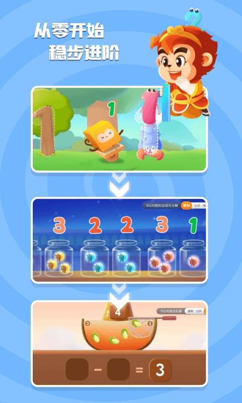 1、手机版悟空数学是依据儿童认知心理特点量身打造的,其内容与互动形式都贴合孩子的认知规律,能够精准地激发孩子对数学的学习兴趣。