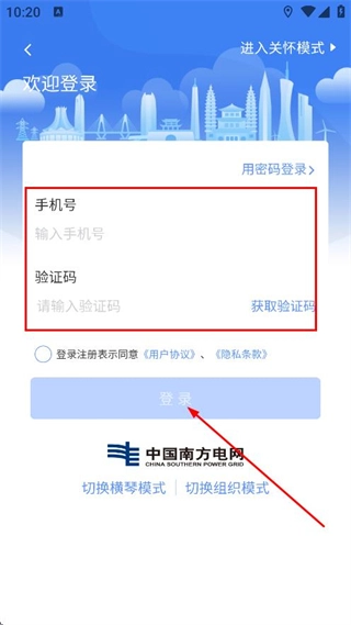 4、输入手机号码,获取并填写验证码,点击登录按钮,完成登录流程。