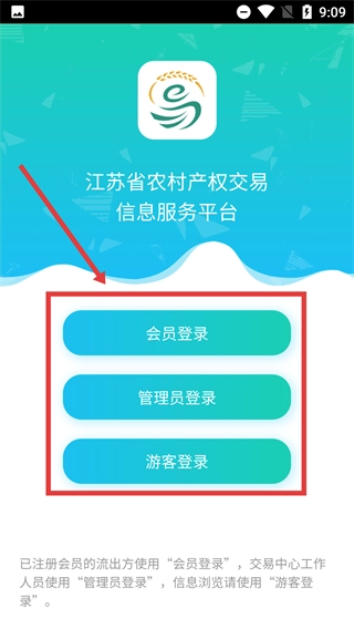 在江苏省农村产权交易信息服务平台的登录界面,用户可依据自身需求,选择【会员登录】【管理员登录】或【游客登录】这几种方式进入平台。