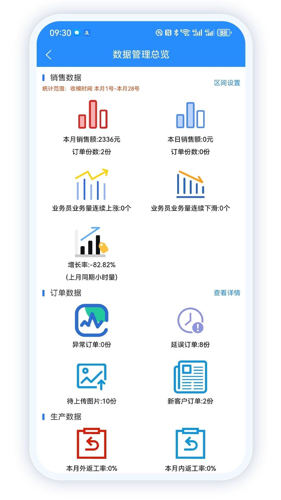 3、数据精准可控,可实时统计销售额、返工率、订单进度等关键数据,为精细化运营提供有力支持。