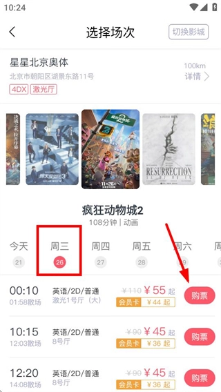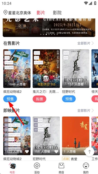 1、进入电影页面后,点击目标影片对应的预售按钮,即可跳转至场次选择页面。
