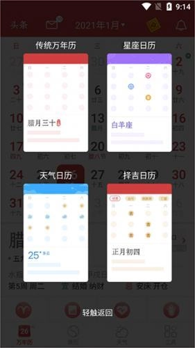 1、覆盖新闻、亲子、情感、旅行、赛事等多元内容板块,支持根据个人阅读偏好进行定制化设置,精准匹配用户的关注方向; 2、整合解梦、经期记录、吉日查询、求签祈福、铃声设置、壁纸更换等实用功能,实现传统文化元素与现代生活场景的有机结合;