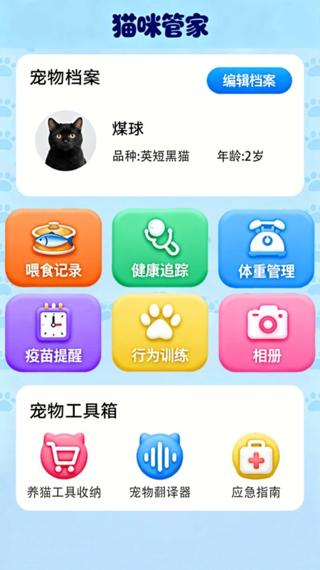 3、猫咪管家页面具备喂食记录、健康追踪、体重管理、疫苗提醒、行为训练等功能,此外还设有宠物工具箱;