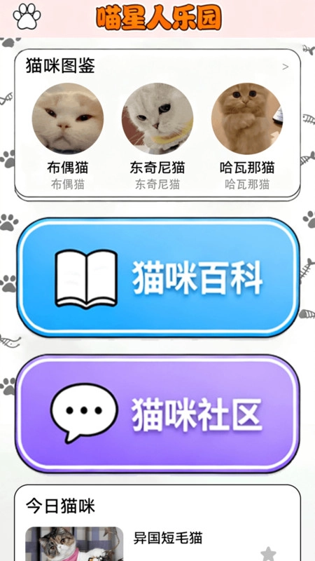 在喵星人乐园里,你能了解到猫咪图鉴、猫咪百科、猫咪社区等各类不同的内容。
