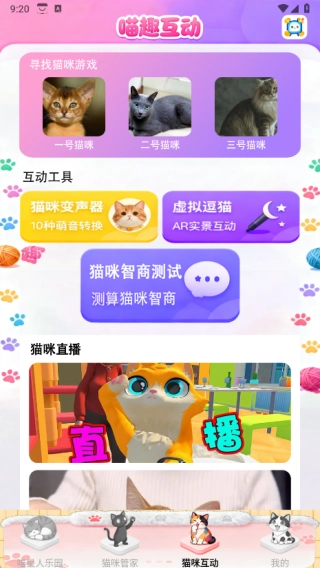 在猫咪互动页面里,你能够开展寻找猫咪游戏、使用猫咪变声器、进行虚拟逗猫以及参与猫咪智商测试等活动。