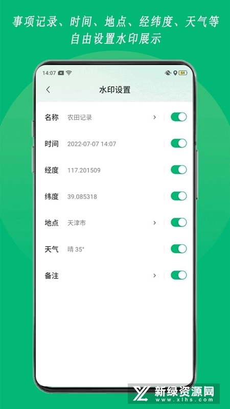 1.以高清画质拍摄农田实况,精准定位当前所在位置 2. 多种水印模板,时间与地点信息不支持修改