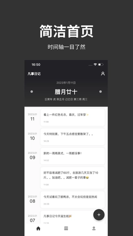 《凡事日记》是一款主打日常记录的工具,采用极简的界面设计,以当前公历日期和农历信息作为引导,搭配励志语句来营造静谧的记录氛围。它的核心功能是让用户快速记录生活里的点滴琐事,通过底部的加号按钮就能一键创建新的记录条目,操作步骤十分简洁。主页和日历视图可以帮助用户回顾不同日期的记录内容,整体结构清晰明了。这款工具的设计理念是弱化繁杂的功能,着重突出文字记录本身,以此鼓励用户坚持书写,非常适合想要培养记录习惯、留存生活片段的个人使用。