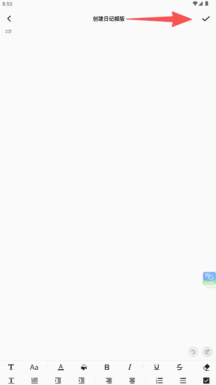 3、进入编辑页面后,输入日记内容,再点击右上角的对勾图标,就能完成操作了。