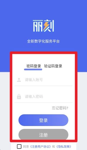 1、用户首次使用丽刻平台时,需通过输入账号密码或验证码的方式完成登录注册流程。