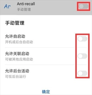 3、由于目前不少国产手机系统存在杀后台的机制,所以我们还需要把这款软件添加到白名单中。这里以华为手机为例,在【手机管家】-【应用启动管理】菜单里找到【Anti-recall】,将所有相关按钮关闭即可。