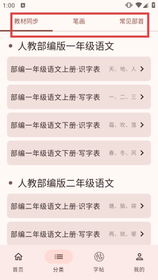 2、进入分类页面后,在顶部找到并点击【笔画】标签,即可查看与笔画相关的教材同步内容。