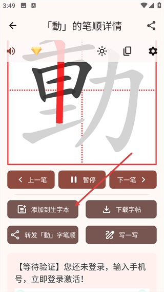 3、进入笔画详情页面后,点击【播放】按钮即可查看笔画动画,借助【上一笔】【下一笔】按钮来浏览笔画顺序,从而学习汉字的书写方法。