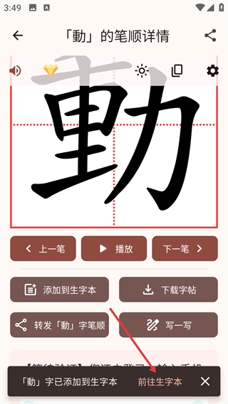 3、弹出“[動]字已添加到生字本”的提示后,点击提示里的“前往生字本”选项。