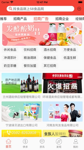 进入应用首页后,您能浏览到平台推荐的招商产品、招商广告以及招商企业等各类相关信息。