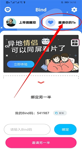 1、启动Bind软件,在首页找到邀请入口,输入Bind码来完成与对方的绑定操作。