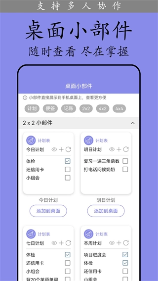 任务共享协作功能支持计划同步,能让你和亲友、同事之间更便捷地监督彼此的任务执行情况,助力习惯养成,从而将单人时间管理模式升级为团队共同创造目标的模式。