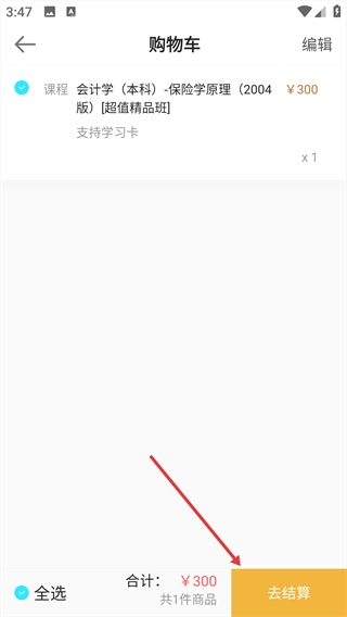 4. 进入购物车页面后,点击页面底部的【去结算】按钮,即可完成报名流程。