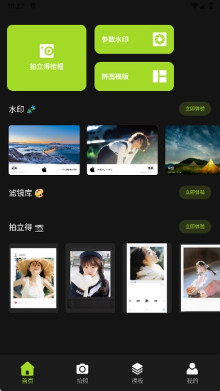 首页包含拍立得相框、参数水印、拼图模板、水印、滤镜库以及拍立得相关功能。