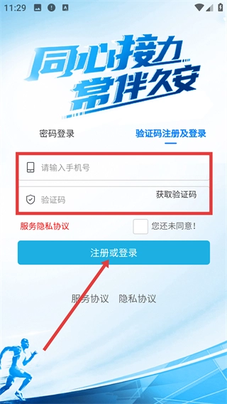2、在验证码页面输入手机号码,点击【获取验证码】按钮,勾选相关协议后,再点击【注册或登录】按钮,即可完成该操作。