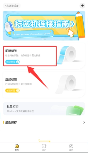 2、在首页找到“间隙标签”功能选项,点击“创建”按钮后即可进入规格选择页面。