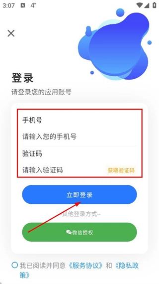 3、于登录页面输入手机号与验证码,勾选相关协议后,点击登录按钮,即可完成账号登录流程。