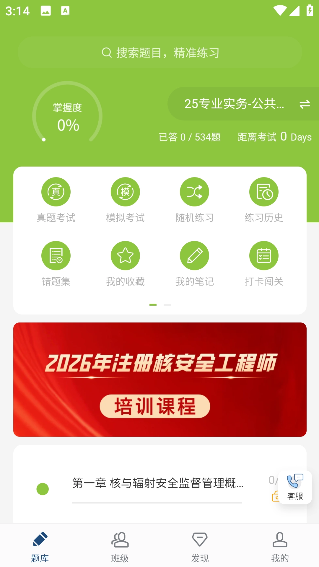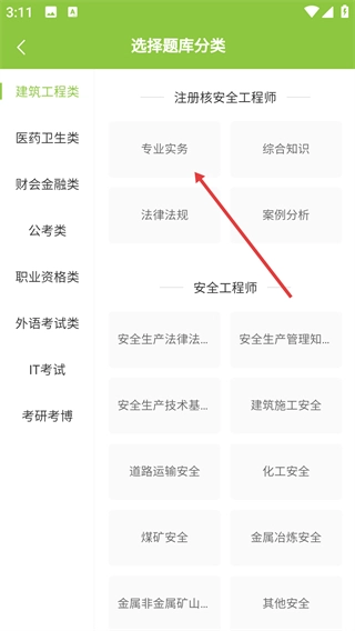 2、进入选择题库的分类页面后,先挑选大类(例如建筑工程类),接着选择细分科目(比如注册核安全工程师-专业实务),以此明确练习的方向。