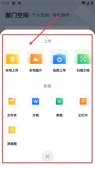 3、打开操作菜单后,能选择【本地上传】【本地图片】等上传选项,也可以新建文档类文件进行操作。